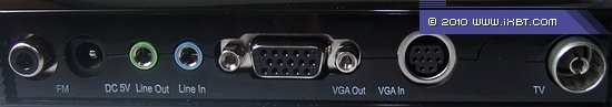 На задней панели находятся разъём RCA для подключения FM-антенны, разъём питания, линейный вход, линейный выход (оба mini-jack 3,5 мм), разъёмы для подключения к монитору (D-Sub female для исходящего сигнала и 9-pin MiniDIN для входящего) и антенный разъём IEC.