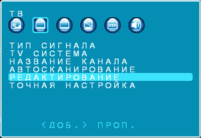 Допускается переименование каналов (название может состоять из четырех букв или цифр, русский язык не поддерживается, для ввода используется четырёхпозиционный джойстик пульта ДУ, кнопка «вниз» отвечает за перемещение вперёд по алфавиту).
