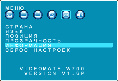 Раздел «Меню» позволяет выбрать регион (Россия, Украина), язык (русский, украинский, английский), настроить положение экранного меню, прозрачность (на этот раз с плавной регулировкой) и предоставляет информацию о версии прошивки (как уже говорилось выше, V1.6P у нашего экземпляра). Здесь же находится сброс всех настроек. Время отображения меню на экране не настраивается, что компенсируется относительно комфортной задержкой по умолчанию.