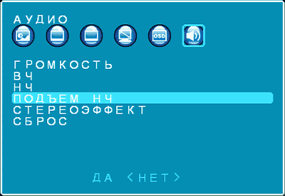 Раздел аудиопараметров содержит настройки уровня громкости, тембра высоких и низких частот, включение/выключение фирменного для Philips/NXP режима Dynamic Bass Boost («Подъём НЧ» в русскоязычном варианте), включение псевдостереоэффекта при монофоническом звуке и возврат к звуковым настройкам по умолчанию.