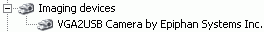 Кроме драйвера для работы со штатным ПО, на сайте Epiphan Systems можно найти WDM-драйвер, позволяющий VGA2USB работать в режиме стандартного устройства видеозахвата (разумеется, такой вариант исключает поддержку программы VGA2USB). После установки этого драйвера (использовалась версия 1.0.4.0000) в разделе Imaging Devices появляется VGA2USB Camera by Epiphan Systems Inc.