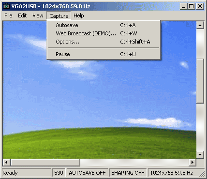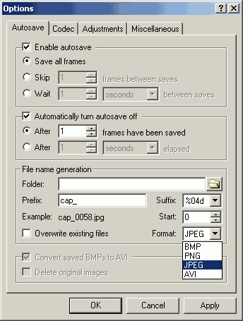 Программа позволяет осуществлять автоматический захват отдельных кадров и запись видеопотока. В разделе Autosave опций программы можно настроить интервалы захвата, как покадрово, так и по времени, выбрать формат (BMP, PNG, JPEG (компрессия составляет 85%), AVI) и установить префиксы названий получаемых файлов. При этом допускается как десятичная система (переменная d в наименовании), так и шестнадцатеричная (переменная X). Возможно преобразование полученных в формате BMP изображений в AVI, выполняемое программой после окончания захвата. Кроме того, реализована функция паузы.