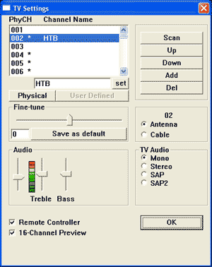 Отмечу, что режим сканирования всего частотного диапазона у них называется «Physical», а сканирование фиксированных частот — «Logical». В остальном все функции очевидны и понятны любому, кому ранее приходилось сталкиваться с компьютерными тюнерами. Каналы можно переназначать, удалять, можно давать им названия. Однако нельзя для каждого канала задать индивидуальный видеостандарт или закрыть его просмотр паролем. К сожалению, на момент тестирования этого тюнера ОРТ еще не начало вещание со стереофоническим звуковым сопровождением, поэтому проверить стереозвук мне не удалось.