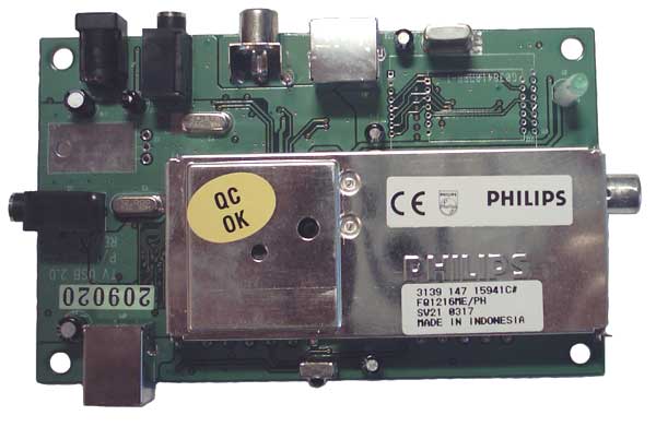 Это уже более похоже на лицевую сторону, тем более что в эту сторону смотрит логотип изготовителя. В соответствии со спецификацией, у этого тюнера имеется стандартный набор внешних входов. Выясняем, что все они расположились на лицевой стороне (разъемы Composite и S-Video, а также mini-jack для звука). А рядом находим разъем для сетевого адаптера питания. Но ведь мы только что прочитали, что он не требуется, так как питание тюнеру подается по USB шине! Внимательное прочтение инструкции подсказывает, что адаптер нужен только для приема японского варианта стандарта NTSC Japan+SAP. Видимо, в этом режиме не хватает обычных 500 мА тока от USB шины. А поскольку в Японии использовать тюнер мы не собираемся, то благополучно забываем про этот разъем питания. Продолжая исследования корпуса тюнера, находим с одного бока антенный вход, а на другом разъем mini-jack для линейного выхода звука. Последний разъем озадачивает. Обычно в USB тюнерах звуковое сопровождение поступает в компьютер по тому же интерфейсу USB. А здесь в документации нигде о такой возможности не упоминается. Наоборот типовая схема подключения тюнера предлагает соединить этот разъем с линейным входом звуковой карты компьютера. Подчинимся рекомендации и в поисках такого кабеля вновь заглянем в коробку из-под тюнера: