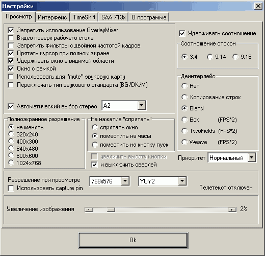 На вкладке Просмотр можно найти выбор нескольких режимов деинтерлейса и настройку масштабирования (общую для всех каналов).