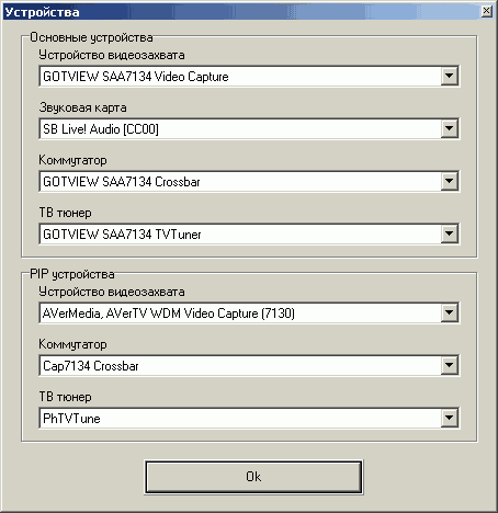Кнопка Устройства служит для настройки режима «Картинка-в-картинке» (PIP). В нашей версии программы была переработана система защиты, приводившая к невозможности работы программы при наличии в системе еще одного тюнера на чипсете от Philips. Однако не следует забывать, что в таком случае используются одинаковые библиотеки драйвера, что может привести, например, к замене уже упомянутого разрешения 768×576 на 720×576.