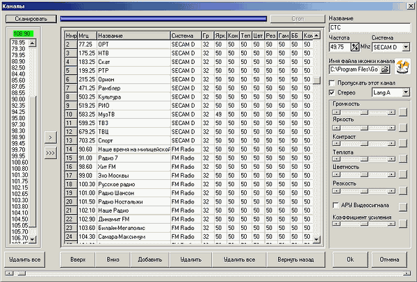 Возможна сортировка каналов, назначение для каждого соответствующей иконки, индивидуальная настройка параметров видеоизображения и отключение автоматической регулировки усиления, в некоторых ситуациях вызывающей «пересвечивание» картинки. Стандарт цветности для любого канала также настраивается индивидуально.