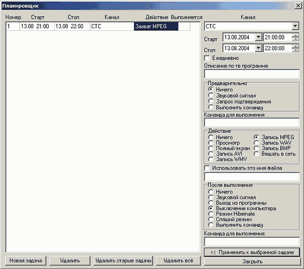 В опциях планировщика можно задать вещание по сети, он также умеет выключать компьютер после записи.