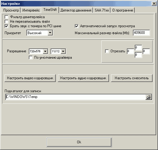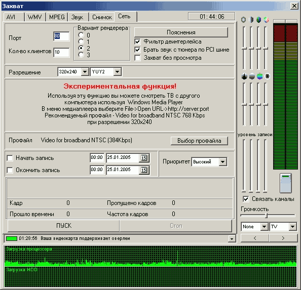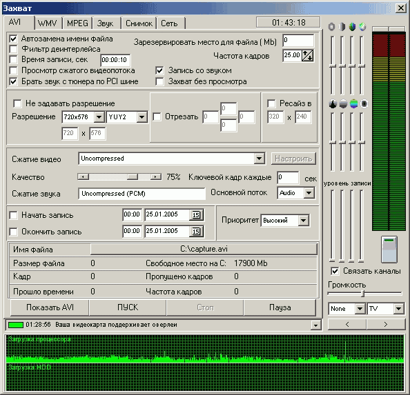 - Программная поддержка записи в форматы AVI/DV/WMV/MPEG-4 с любым установленным в системе кодеком