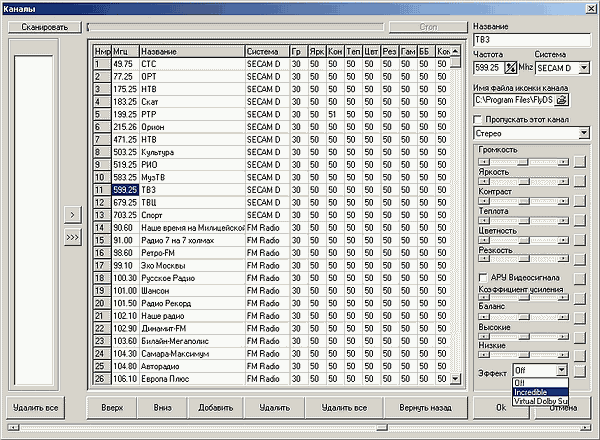 Несколько слов о декодировании звука. Особенностью стандарта стереозвука NICAM, принятого в России в качестве государственного, является частота дискретизации 32 КГц. Таким образом, поддержка 48 КГц не дает никакого преимущества в качестве звука при работе с NICAM Stereo (при последующей обработке записанного контента эта возможность может быть полезна). К счастью, это ограничение не касается каналов с A2 (часто встречающихся у провайдеров кабельного телевидения), FM-станций и каналов с монофоническим звуком. Опять же, индивидуальные настройки высоких и низких частот, баланса и звуковых эффектов могут быть полезны в любых условиях.