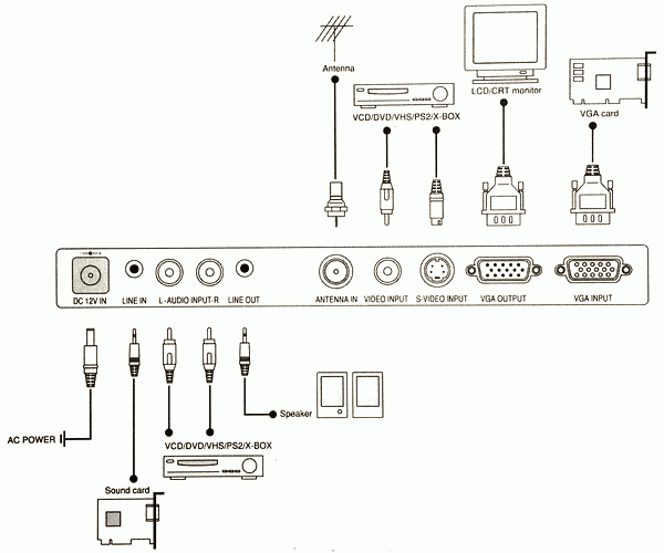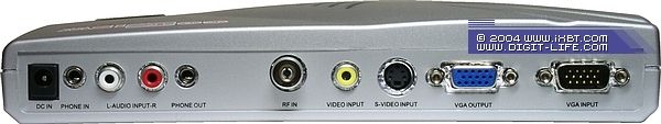 На задней панели размещается полный комплект разъемов: разъем питания (12В), аудиовход (mini-jack), линейный звуковой вход (2 RCA), аудиовыход (mini-jack), антенный вход, композитный и S-Video входы, VGA-разъемы.