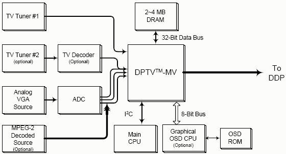 Заявленная функция Adaptive Static Detect De-interlacing обязана своим появлением заложенной в чип технологии Dynamic motion & Edge Adaptive De-interlacing. Кроме этого, в DPTV-MV предусмотрены такие возможности, как система шумоподавления Dynamic temporal frame-filtering noise reduction, динамический контроль гаммы Dynamic gamma control и динамическое ограничение уровня белого Dynamic white peak level restriction.