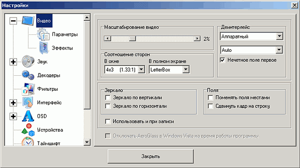 При работе с цифровыми каналами доступны только настройки масштабирования, выбор видеорендерера и параметры выбранного декодера.