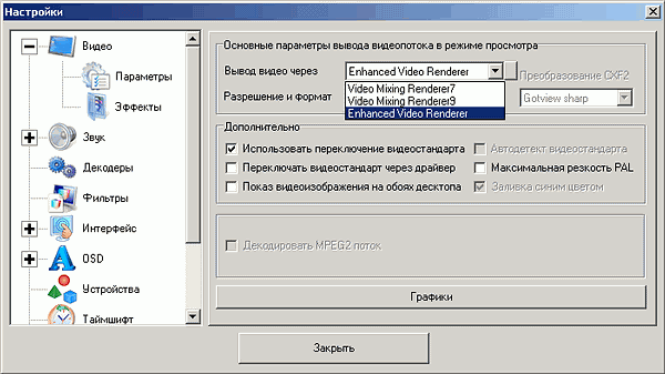 В подразделе Параметры можно найти настройки вывода видеопотока в режиме просмотра — выбор разрешения и рендерера. В последних версиях к VMR7 и VMR9 добавился Enhanced Video Renderer (EVR), доступной при работе под Windows Vista (под Windows XP требуется установка Microsoft .NET Framework версии 3.0 и выше), с выбором одного из двух режимов.