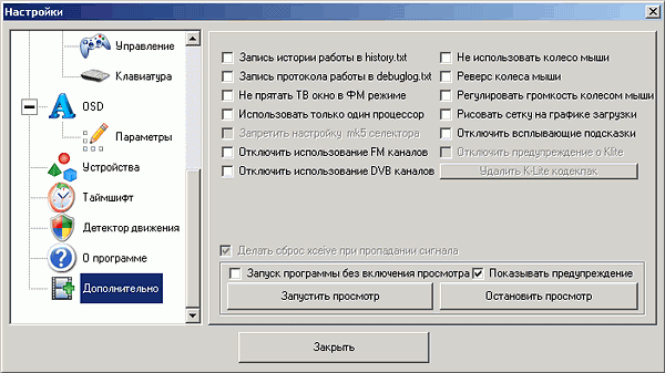 В дополнительных настройках (напомним, что для отображения активируется в подразделе Управление) находятся такие опции, как ускоренный запуск программы, работа на одном процессоре/процессорном ядре, запись протокола работы в файл (может быть полезна при обращении в службу поддержки производителя), запуск программы без включения просмотра, отключение FM и/или DVB каналов и т. д.