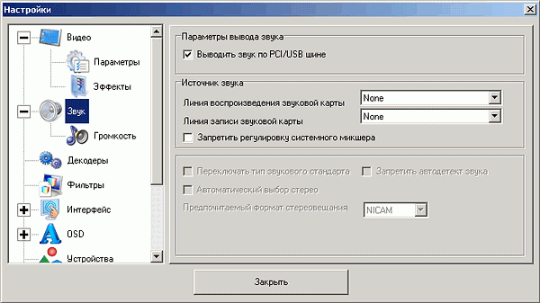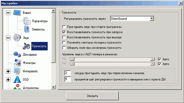 Для управления громкостью отведён отдельный подраздел, из доступных в котором настроек можно отметить выбор регулировки громкости через системный микшер или средствами DirectSound и раздельную ручную регулировку уровня звука с АЦП для TV- и FM-режимов.