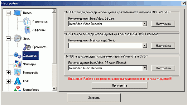 Выбор декодеров для MPEG2 и h.264/AVC, ранее скрытый в дебрях файла decoders.ini, получил отдельное меню с доступом к настройкам каждого декодера.