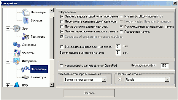 В подразделе Управление можно найти опцию включения всплывающей от движений мышью панели в полноэкранном режиме. Напомним о режиме Master/Slave, отличающемся от давно реализованной «картинки-в-картинке» (Picture-In-Picture, PIP). При наличии второго устройства видеозахвата (выбор осуществляется в разделе Устройства) Master/Slave (для активации настройки необходимо снять запрет на запуск второй копии программы) предусматривает полноценную работу двух копий одной программы с двумя устройствами без необходимой для этого ранее физической установки второго экземпляра с последующим внесением изменений в конфигурационные файлы. Независимо от последовательности выхода при следующих запусках программа работает с основным устройством. Единственное ограничение — отсутствие поддержки тюнеров сторонних производителей.