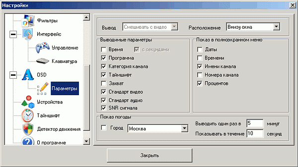 Подраздел Параметры позволяет выбрать показатели, выводимые на экран в оконном и полноэкранном режиме. Для отображения дополнительной информации используется кнопка «С». Из дополнительных функций упоминания заслуживают отображение прогноза погоды (требуется интернет-соединение) и мощности сигнала как в цифровом, так и в аналоговом режиме. Вывод на экран мощности (при повторном нажатии чекбокс, отвечающий за мощность, позволяет выводить некое среднее значение отношения сигнал/шум (ОСШ, SNR), выдаваемое ВЧ-блоком) поддерживается всеми тюнерами компании, оснащёнными приёмниками от Xceive, в число которых входит и USB 2.0 Hybrid MasterStick. Несмотря на то, что при работе с аналоговым вещанием результат выдаётся в виде двух значений с шагом 10 dB («40-50 dB», «50-60 dB» и т. д.), даже в таком виде он способен значительно облегчить поиск возможных причин ухудшения изображения. DVB-T вещание обеспечивает более высокую точность определения этого параметра.