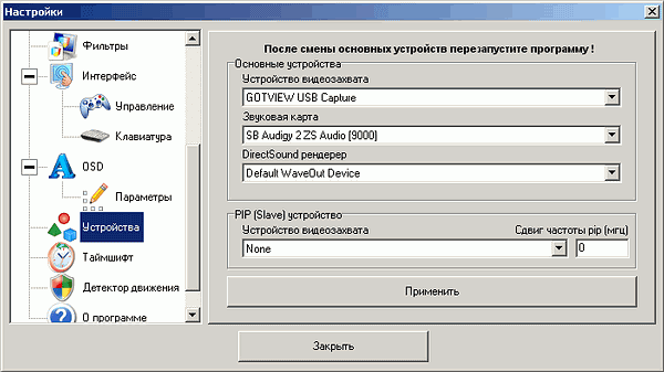 Название раздела Устройства говорит само за себя. Здесь можно выбрать устройство видеозахвата, звуковую карту, DirectSound рендерер и вторичное устройство для режимов PIP и Slave.