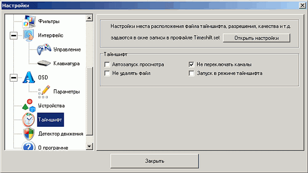 Настройкам режима отложенного просмотра (автозапуск просмотра, удаление буферного файла, блокировка переключения каналов, запуск при старте программы), посвящён раздел Таймшифт. Настройки потока (используется программное сжатие в MPEG2 при помощи кодека от InterVideo с заданными пользователем параметрами) также доступны и в меню записи при редактировании одноимённого профиля.