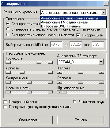 Такой подход подразумевает общее меню поиска с возможностью выбора формата и установкой видеопараметров по умолчанию для аналоговых каналов. Любопытной возможностью является выбор названия из списка основных каналов. Разумеется, ручной ввод также никуда не делся.