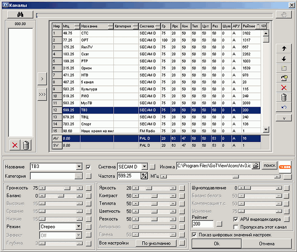 Программа имеет общий интерфейс для TV- и FM-режимов. Как мы уже говорили выше, список FM-станций объединен с телевизионными (в нашем случае аналоговыми и цифровыми) каналами, поиск также осуществляется аналогичным образом.