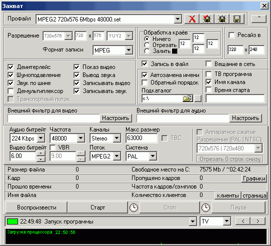 - Программная поддержка записи в форматы AVI/DV/WMV/MPEG4 с любым установленным в системе кодеком