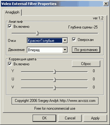 Доступны регулировки, позволяющие повысить эффект объема, выбор типа очков (жёлто-синие, фиолетово-зелёные и красно-голубые) и регулировка видеопараметров. В отличие от модуля BPP_Anaglyph для тюнеров от Beholder, данный фильтр является полностью бесплатным (!) для некоммерческого использования и может использоваться для обработки изображения в любой из существующих программ.