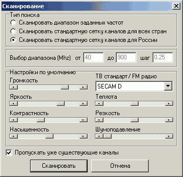 - Сканирование каналов в любом указанном диапазоне, с любым заданным шагом