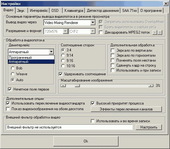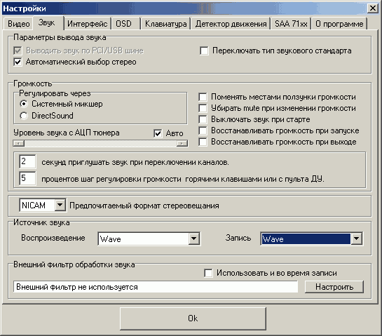 Изменились и звуковые настройки. Пункты Регулировать громкость средствами тюнера и Управлять звуковой картой трансформировались в управление громкостью через системный микшер или Direct Sound и появилась настройка уровня звука с АЦП тюнера.