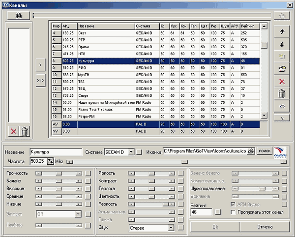 - Индивидуальные настройки для каждого канала: громкость, яркость, теплота, цветность, резкость, тип кодировки