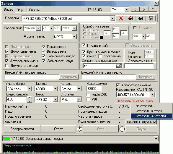 - Программная поддержка записи в форматы AVI/DV/WMV/MPEG4 с любым установленным в системе кодеком