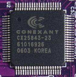 10-битный CX25843-23 от Conexant Systems, Inc. поддерживает декодирование всех существующих стандартов стереозвука. Кроме того, в этих АЦП реализованы трёхполосный эквалайзер и регулировка баланса.