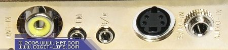 Коммутацию стандартной назвать нельзя. Подключение TV-антенны реализовано при помощи разъёма RCA (!). Переходник IEC — RCA предустановлен на плате, контакт в разъёме достаточно плотный. FM-антенна имеет разъём mini-jack 2,5 мм, обычно используемый для подключения ИК-датчиков. Усугубляет эту вакханалию наличие одного разъёма S-Video для подключения внешних видеоисточников (для захвата композитного сигнала также используется переходник). В такой ситуации неопытному пользователю могут помочь имеющиеся подписи к разъёмам.