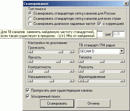 - Сканирование каналов в любом указанном диапазоне, с любым заданным шагом