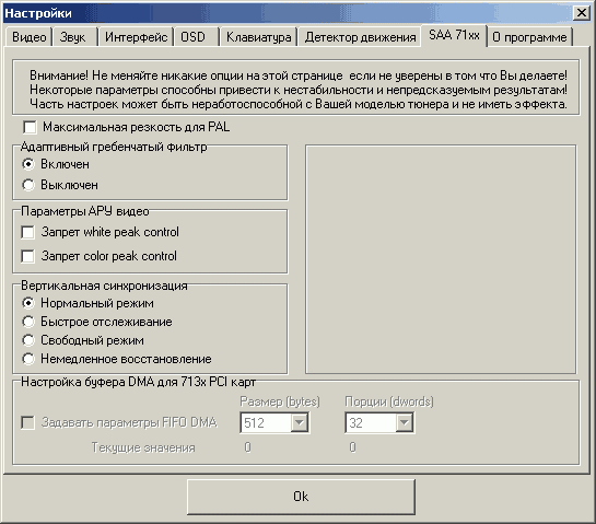 Для адептов тонкой настройки появились отключение адаптивного гребенчатого фильтра и возможность задать порог фазы Сomb фильтра CX25843 (чекбокс Максимальная резкость для PAL). Для доступа к этим опциям (не стоит пугаться надписи SAA 71xx, это всего лишь дань традициям) служит параметр AdvancedMode=1 в файле локальных настроек settings.ini.