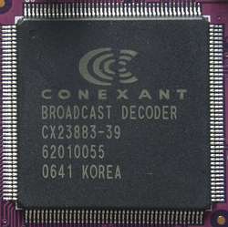 АЦП вызывает некоторое удивление. Тогда как большая часть конкурирующих моделей с интерфейсом PCI использует аналогово-цифровые преобразователи от Philips (в настоящее время полупроводниковое подразделение является самостоятельной компанией NXP Semiconductors с соответствующими изменениями в маркировке новых партий), PCI Hybrid несёт на борту 10-битный CX23883-39 с поддержкой всех существующих видео- и аудиостандартов от Conexant Systems, Inc.. Впрочем, качество изображения, обеспечиваемое этой микросхемой, ничуть не уступает популярным SAA713x, что же касается потенциально интересных отличий в дополнительных возможностях разных АЦП, то о них мы поговорим далее по тексту.