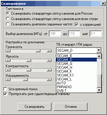 - Сканирование каналов в любом указанном диапазоне, с любым заданным шагом