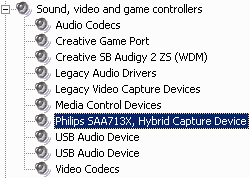 После установки драйвера в раздел Sound, video and game controllers добавляется Philips SAA713x, Hybrid Capture Device.