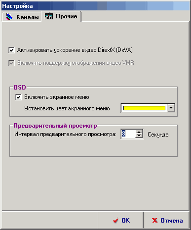 На вкладке Прочие доступны включение/отключение аппаратной DXVA-акселерации, выбор цвета экранного меню и время отображения канала в режиме многоканального (матрица из 9 окон) предварительного просмотра.