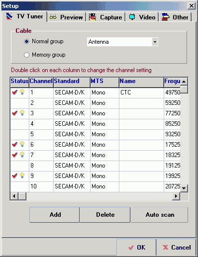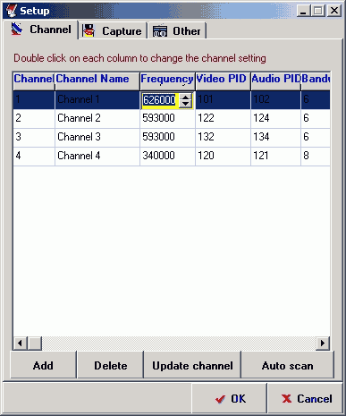 В появившемся списке возможная ручная установка параметров для каждого канала. Так как стандарт DVB-T позволяет передавать на одной частоте несколько каналов, для идентификации станций используются параметры VPID (Video Program Identification) и APID (Audio Program Identification). Допустимо и ручное добавление каналов.