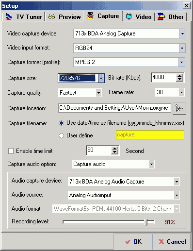 Для захвата в MPEG2 используется кодек от Honest Technology. Запись в MPEG4 возможна с кодеками от Microsoft или DivX (выбор осуществляется в разделе Other). При этом доступны только основные настройки.