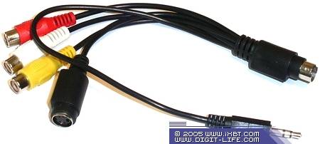 Коммутация с внешними устройствами организована при помощи переходника-разветвителя 9-pin — 2 RCA (аудио) + RCA (видео) + S-Video + mini-jack.