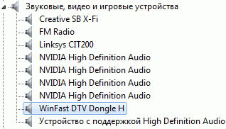 После установки в разделе Звуковые, видео и игровые устройства диспетчера устройств появляется запись WinFast DTV Dongle HT,