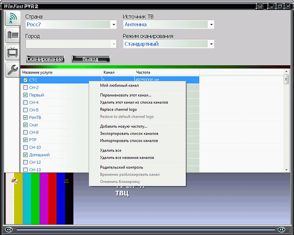 Кроме поиска аналоговых каналов по списку с выбором антенного/кабельного диапазона и по частоте (адаптированное сканирование), поддерживаются экспорт/импорт списка, ручной ввод частоты, список избранных и блокировка нежелательных для просмотра каналов паролем (родительский контроль).