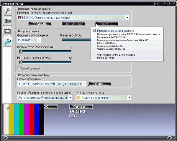 Захват кадров (как одного, так и серии с настраиваемым интервалом и количеством) осуществляется в форматах BMP, JPEG, PNG и TIFF. Возможность предварительного просмотра захваченных кадров отсутствует. Опция «Список быстро настроенных каналов» заслуживает подробного описания. В отличие от производителей, реализующих быстрый доступ к списку каналов через контекстное меню, вызываемое по нажатию правой кнопки мыши, Leadtek использует другой подход — список становится доступен либо при наведении курсора на верхнюю часть панели WinFast PVR2, либо при нажатии левой кнопки мыши в том же месте.