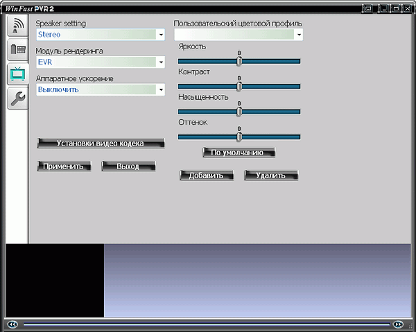 Для программного декодирования используется кодек ArcSoft с поддержкой H.264, поэтому место выбора стороннего декодера, доступного в предыдущих версиях WinFast PVR 2, заняла настройка акустической системы.