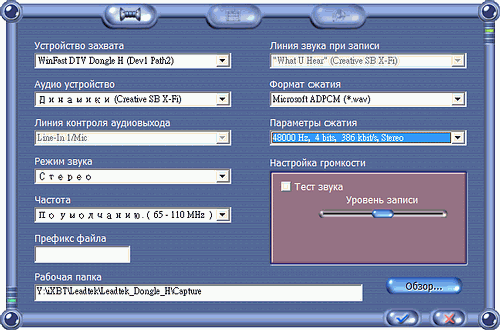 В разделе звуковых опций предусмотрен раздельный выбор устройств для воспроизведения и для записи, что позволяет избежать проблем с современными интегрированными аудиокодеками. Однако для WinFast DTV Dongle H эти настройки недоступны.