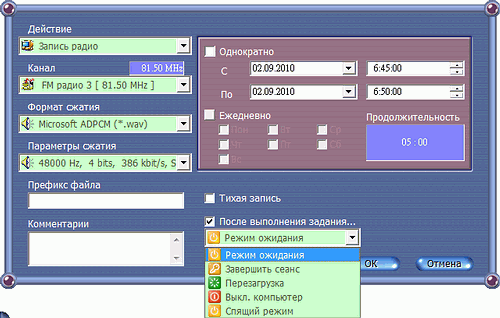Планировщик поддерживает режим фоновой записи. После окончания запланированного задания возможны отключение компьютера и переход в ждущий режим.
